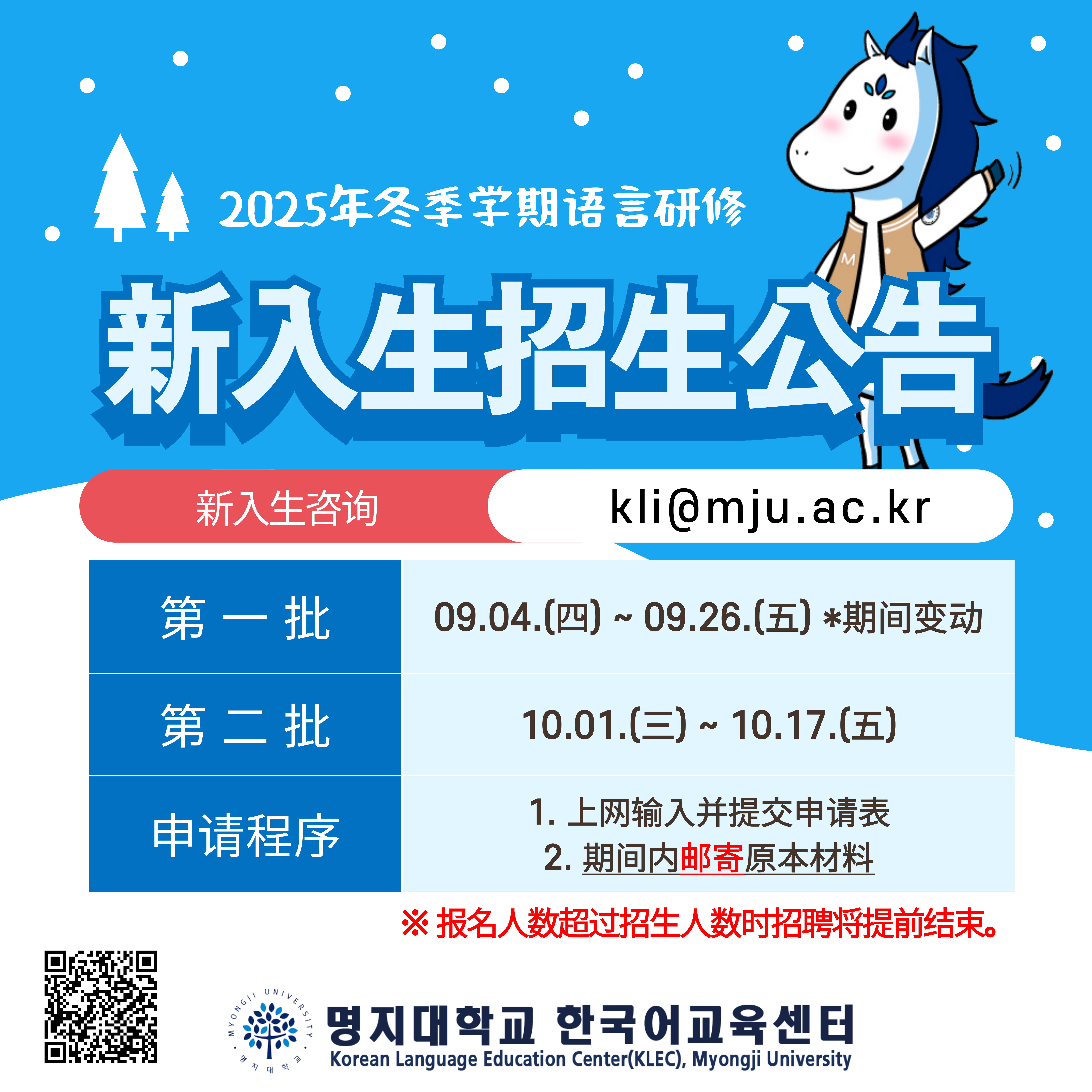 明知大学韩国语教育中心冬季学期新入生招生从2025.9.4. 开始到2025.9.26.截止。